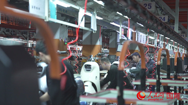 “從零件到整車,一輛雅迪電動車的組裝只需要1200秒?!痹谘诺瞎就猓诺想妱榆嚿a管理部生產二組組長陳紋自豪地告訴人民網記者。后剎線、動力線、平叉、減震、電機、前輪、方向把、龍頭……在雅迪廠區(qū),工人在流水線上不同崗位分工操作,一臺整車下線只要20分鐘。“11個流水線,每條流水線每天生產1000-1200輛電動車,”陳紋說。