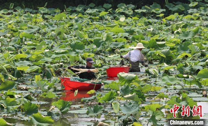 5月23日,武漢蔡甸藕農正在荷塘里“抽”藕帶?!≈行律缬浾?張暢 攝
