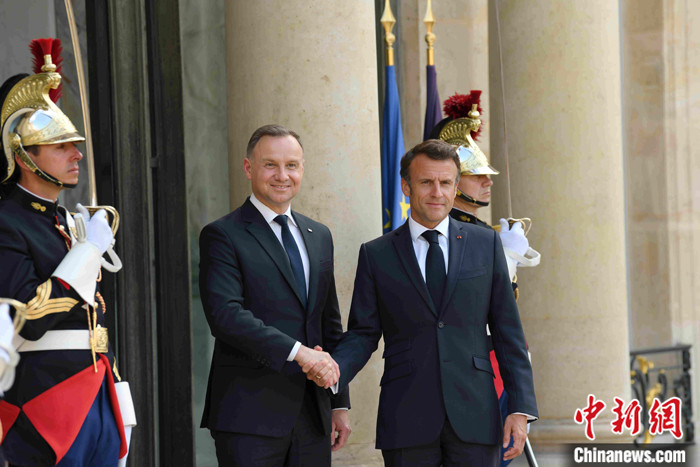 當(dāng)?shù)貢r(shí)間6月12日晚,法國(guó)總統(tǒng)馬克龍?jiān)诎屠钀埯惿釋m與德國(guó)總理朔爾茨、波蘭總統(tǒng)杜達(dá)會(huì)面。他們共同出席“魏瑪三角”機(jī)制下的三國(guó)領(lǐng)導(dǎo)人會(huì)議。 中新社記者 李洋 攝