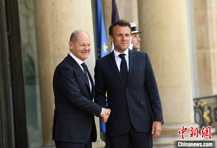 當(dāng)?shù)貢r(shí)間6月12日晚,法國(guó)總統(tǒng)馬克龍?jiān)诎屠钀埯惿釋m會(huì)見德國(guó)總理朔爾茨。朔爾茨前來出席當(dāng)天舉行的法德波三國(guó)領(lǐng)導(dǎo)人會(huì)談。 中新社記者 李洋 攝