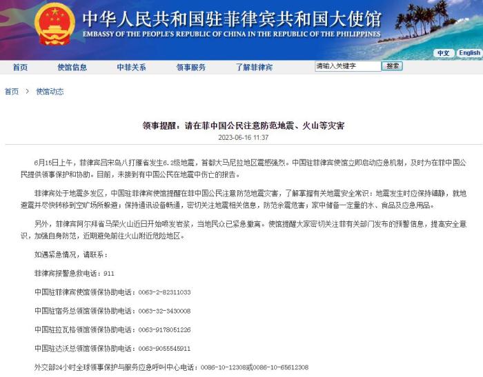 中新網(wǎng)6月16日電 據(jù)中國駐菲律賓大使館網(wǎng)站消息,6月15日上午,菲律賓呂宋島八打雁省發(fā)生6.2級地震,首都大馬尼拉地區(qū)震感強烈。中國駐菲律賓使館立即啟動應急機制,及時為在菲中國公民提供領(lǐng)事保護和協(xié)助。目前,未接到有中國公民在地震中傷亡的報告。