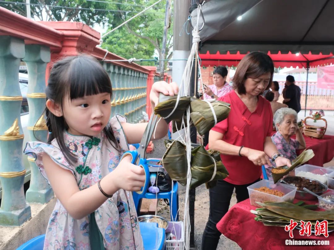 2023年6月18日,馬來(lái)西亞馬六甲舉行端午龍舟系列活動(dòng),包括游龍舟、裹粽比賽等,吸引當(dāng)?shù)馗髯逡崦癖妳⑴c。圖為有的家庭四代同堂齊上陣。奶奶在一旁包粽子,四歲的曾馨怡小朋友給包好的粽子修剪粽葉。陳悅 攝