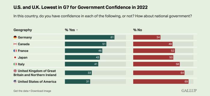 據(jù)《國會山報》當(dāng)?shù)貢r間7月3日報道,根據(jù)蓋洛普最新發(fā)布的一項針對七國集團政府信心指數(shù)的民意調(diào)查顯示,美國和英國獲得的信心指數(shù)最低。