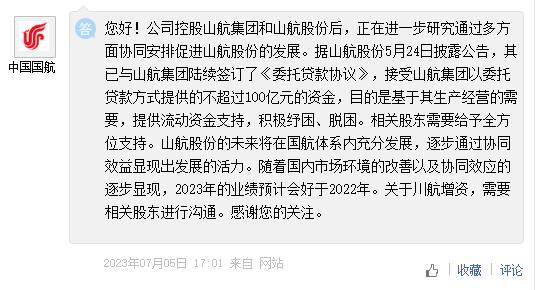 對于上述收購,中國國航于7月5日在投資者互動平臺回應稱,公司控股山航集團和山航股份后,正在進一步研究通過多方面協(xié)同安排促進山航股份的發(fā)展。