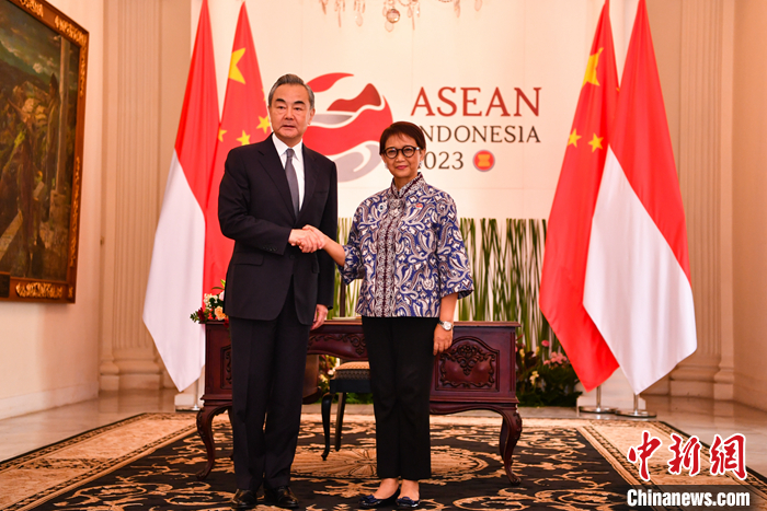當(dāng)?shù)貢r(shí)間7月12日,中央外辦主任王毅在雅加達(dá)會(huì)見印尼外長(zhǎng)蕾特諾。 中新社發(fā) 徐欽 攝