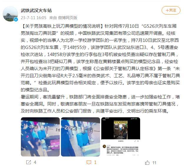 經(jīng)核實,視頻中的當事人為北京一學(xué)校游學(xué)團隊的一名學(xué)生,持7月10日武漢至北京西的G526次列車車票,于14時55分,該游學(xué)團隊從武漢站東進口3、4、5號通道安檢依次進站,14時58分該學(xué)生的行李包在3號機被安檢員查出疑似存在管制刀具,并開包檢查出3把疑似刀具,該學(xué)生稱是在黃鶴樓景點購買的模型紀念品,經(jīng)安檢人員確認為未開刃的刀具模型,根據(jù)《公安部關(guān)于管制刀具認定標準》第一條“未開刃且刀尖倒角半徑R大于2.5毫米的各類武術(shù)、工藝、禮品等刀具不屬于管制刀具范疇?!睓z查此玩具模型符合相關(guān)規(guī)定,便予以放行。該學(xué)生的母親也證實是購買的模型紀念品。