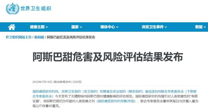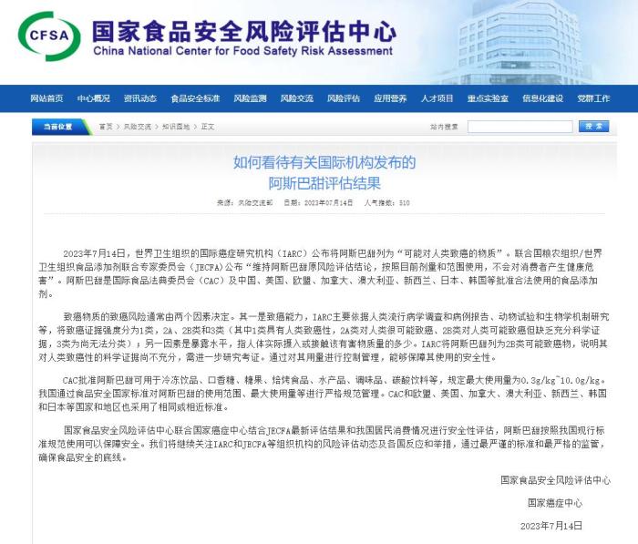 14日晚,國(guó)家食品安全風(fēng)險(xiǎn)評(píng)估中心網(wǎng)站發(fā)布《如何看待有關(guān)國(guó)際機(jī)構(gòu)發(fā)布的阿斯巴甜評(píng)估結(jié)果》。