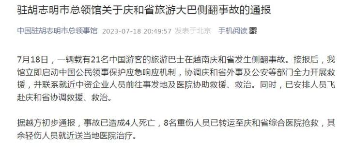 中新網(wǎng)7月18日電 據(jù)中國(guó)駐胡志明市總領(lǐng)事館微信公眾號(hào)18日消息,7月18日,一輛載有21名中國(guó)游客的旅游巴士在越南慶和省發(fā)生側(cè)翻事故。