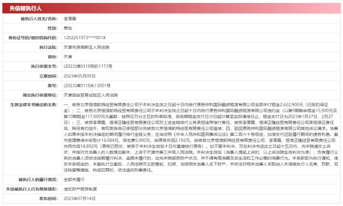 中國執(zhí)行信息公開網顯示,目前恒信璽利存在多條被執(zhí)行人信息,恒信璽利和李厚霖也多次收到限制消費令。