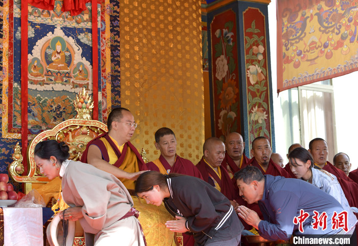 7月17日,班禪在雪林多吉頗章為信眾系上哈達(dá)。 中新社記者李林 攝