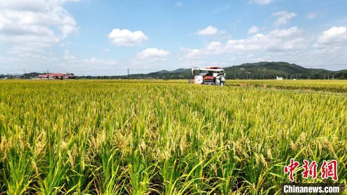 中新網(wǎng)福建長汀7月17日電 (朱芳彬 丘偉華)眼下,位于福建省龍巖市長汀縣河田鎮(zhèn)的遠豐優(yōu)質(zhì)稻生產(chǎn)基地又迎來豐收,基地里的水稻陸續(xù)成熟進入收割期,機械化按下開鐮收割夏收“快進鍵”。
