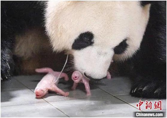 當(dāng)?shù)貢r間2023年7月7日,大熊貓“愛寶”在韓國三星愛寶樂園產(chǎn)下雙胞胎幼崽。圖為“愛寶”與幼崽。 (韓國三星愛寶樂園供圖)