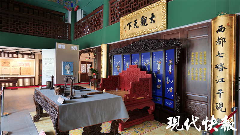 館內(nèi)鴛鴦廳為“何以狀元”主題展廳,通過實物展品再現(xiàn)古代科舉流程,介紹了一個狀元是如何誕生的?,F(xiàn)代快報記者了解到,2001年,在整修鴛鴦廳時,曾在上方發(fā)現(xiàn)一方被后人所加“吊頂”遮住的匾。潘世恩高中狀元后,為官五十余年,歷經(jīng)四朝,深得皇帝恩寵,被譽為“三百年間第一福氣之人”。每逢大壽,皇帝都會親賜御匾。后經(jīng)專家考證,該匾即是道光皇帝于潘世恩六十大壽之時御筆賞賜的黑底盤龍金書方匾。