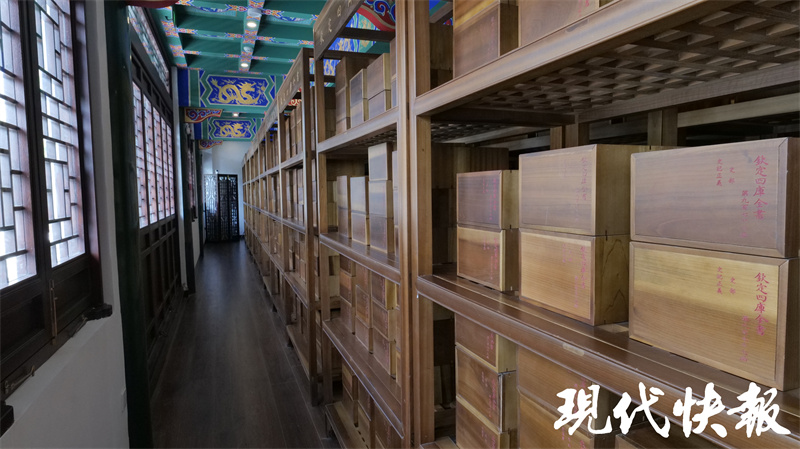 文匯閣二樓、三樓收藏了一部《四庫全書》,據(jù)了解,這部《四庫全書》是2013年由商務印書館榮譽出版、揚州國書文化公司策劃制作的原樣、原大、原色《四庫全書》復制本。它與原書大小、顏色、紙質(zhì)、裝幀相同,封面仍是絹帛五色:經(jīng)部綠色、史部紅色、子部月白色、集部灰黑色、總目黃色。書籍與書函、書架配套,共計木函6144個、書架128個?!端膸烊珪返难b潢非常考究,每部書籍都用兩片楠木片夾住,束以綢帶,再放入楠木盒中。盒蓋上刻有書籍的書名和所屬部類順序等信息,以便查閱?,F(xiàn)在,游客經(jīng)過預約就可以可到二樓參觀《四庫全書》部分藏書,親身感受這套浩瀚巨制。