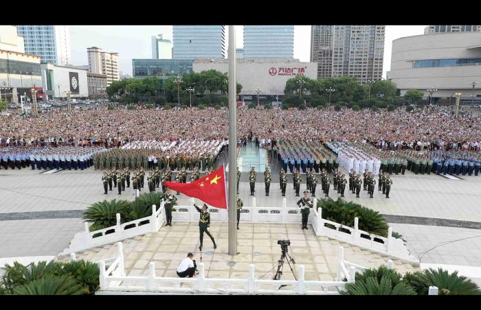 集中交流賽開幕式之前,參賽軍隊院校官兵與南昌市組織的軍(警)、消防、地方院校、退役軍人等相關(guān)代表共約1000人,參加了“弘揚愛國志,奮進新征程”升旗儀式。