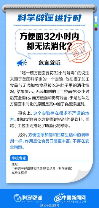中新網(wǎng)8月1日電 “吃一碗方便面要花32小時解毒”的說法來源于美國科學家的一個實驗,但這個實驗存在很多不嚴謹?shù)牡胤?。方便面添加劑和日常生活中的調(diào)味劑一樣,作用是讓食品口感更豐富,不存在安全問題。(來源:@科學辟謠 @中國新聞網(wǎng) )