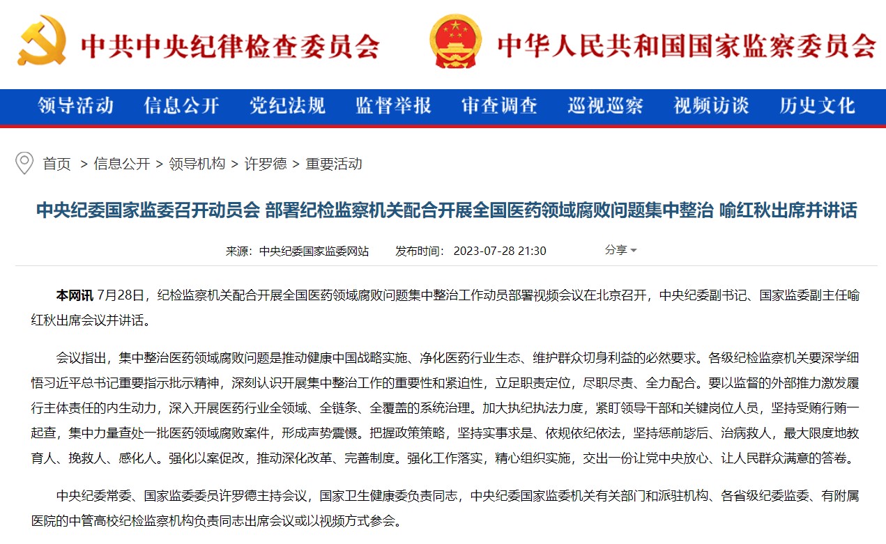 7月21日,國(guó)家衛(wèi)生健康委會(huì)同教育部、公安部、審計(jì)署、國(guó)務(wù)院國(guó)資委、市場(chǎng)監(jiān)管總局、國(guó)家醫(yī)保局、國(guó)家中醫(yī)藥局、國(guó)家疾控局、國(guó)家藥監(jiān)局,十個(gè)部門聯(lián)合召開視頻會(huì)議,部署開展為期1年的全國(guó)醫(yī)藥領(lǐng)域腐敗問題集中整治工作。