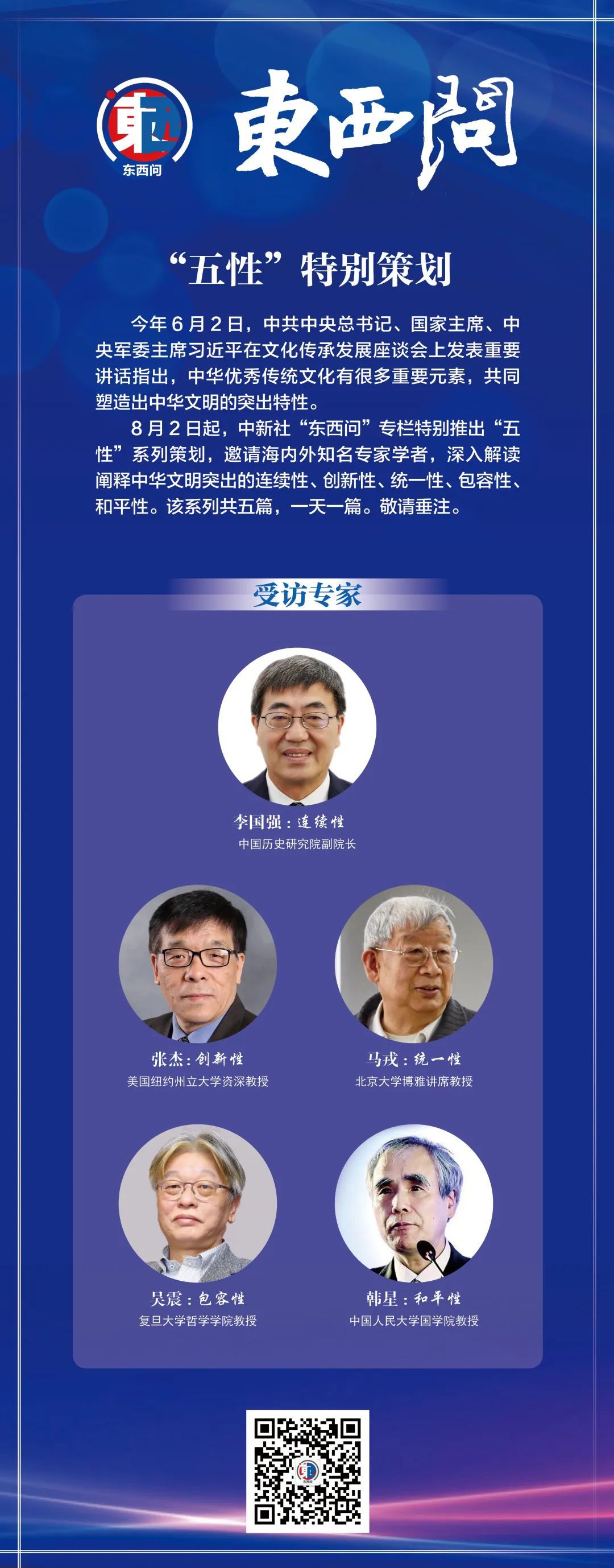 8月2日起,中新社“東西問(wèn)”專(zhuān)欄特別推出“五性”系列策劃,邀請(qǐng)海內(nèi)外知名專(zhuān)家學(xué)者,深入解讀闡釋中華文明突出的連續(xù)性、創(chuàng)新性、統(tǒng)一性、包容性、和平性。該系列共五篇,一天一篇。敬請(qǐng)垂注。
