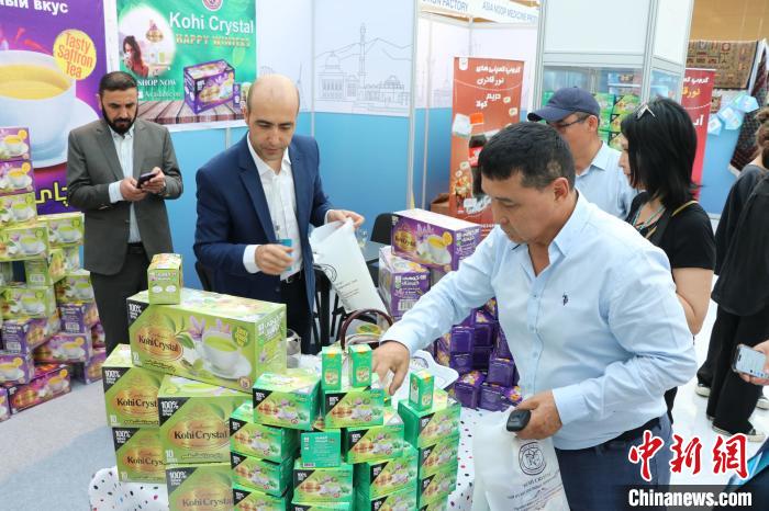 當(dāng)?shù)貢r間8月3日,哈薩克斯坦阿斯塔納,阿富汗商品展當(dāng)日啟幕。圖為阿富汗茶葉展位吸引當(dāng)?shù)仡櫩婉v足?! ≈行戮W(wǎng)記者 張碩 攝