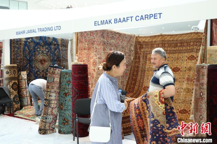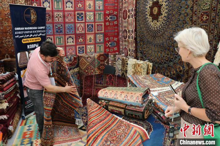 當(dāng)?shù)貢r間8月3日,哈薩克斯坦阿斯塔納,阿富汗商品展當(dāng)日啟幕。圖為展商向哈顧客展示阿富汗手工羊毛地毯?! ≈行戮W(wǎng)記者 張碩 攝