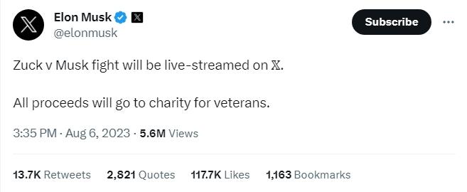 據(jù)報(bào)道,當(dāng)天,馬斯克在社交媒體X發(fā)文稱,“扎克伯格與馬斯克之戰(zhàn)將在X上直播。所有收益將捐給退伍軍人慈善機(jī)構(gòu)?!?/p>