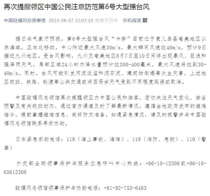 中國駐福岡總領(lǐng)館再次提醒領(lǐng)區(qū)內(nèi)中國公民和游客,密切關(guān)注天氣變化、安全預(yù)警及有關(guān)航班動態(tài),通過官方渠道及時了解最新情況,遵循當(dāng)?shù)卣l(fā)布的避難指令,提前掌握避難信息、做好防災(zāi)準(zhǔn)備。如遇緊急情況,請及時報警并與中國駐福岡總領(lǐng)館聯(lián)系尋求協(xié)助。