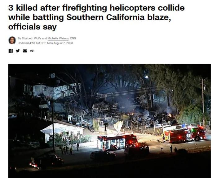 中新網(wǎng)8月7日電 綜合美媒報(bào)道,美國消防官員表示,當(dāng)?shù)貢r(shí)間8月6日,一架被派往加州撲滅野火的消防直升機(jī)與另一架消防直升機(jī)相撞,造成3人死亡。