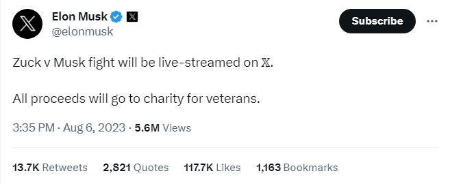 當日晚些時候,扎克伯格在自家的社交平臺“Threads”上回應,“我已經(jīng)做好了準備”,并說:“我們不應該使用一個能真正籌措慈善資金的更可靠平臺嗎?”