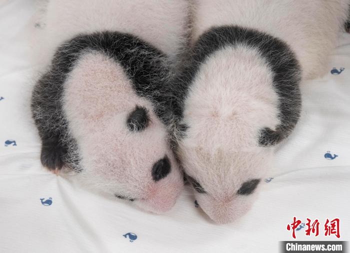 當(dāng)?shù)貢r(shí)間8月7日,韓國(guó)三星愛寶樂園公布雌性雙胞胎大熊貓幼崽(左為姐姐)于前一天拍攝的滿月照。 (愛寶樂園供圖)
