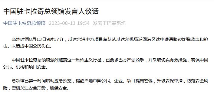 中國駐卡拉奇總領(lǐng)館強烈譴責(zé)這一恐怖主義行徑,已要求巴方嚴(yán)懲兇手,并采取切實有效措施,確保中國公民、機構(gòu)和項目安全。