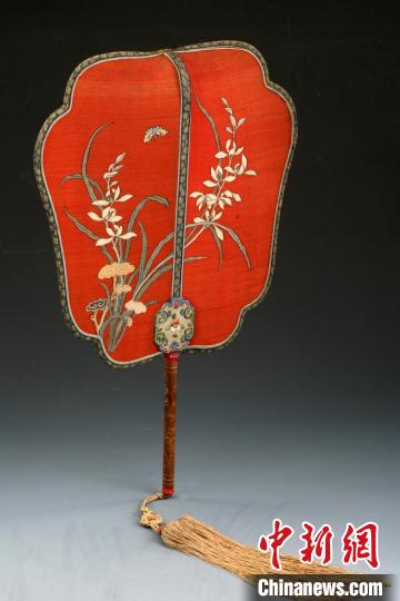 沈陽故宮院藏的清檀木柄大紅緙絲蘭蝶扇為清宮后妃日常生活用品?!?沈陽故宮博物院供圖)