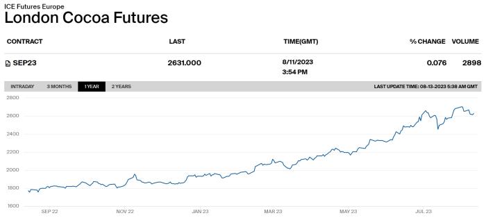 不僅僅是可可,制作巧克力所需的另一種主要成分食糖,今年以來,期貨價格也持續(xù)處于高位。