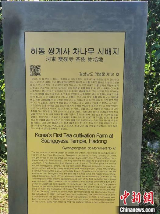 田杰:茶是什么時候、如何傳入韓國的,說法比較多。不過普遍認為韓國茶文化是始于朝鮮半島的三國時期。有“新羅善德女王時期萌芽,興德王時期盛行”的說法。據(jù)記載,新羅興德王3年,也就是公元828年,興德王派使臣“大廉”出使中國?;貒臅r候大廉帶回了茶種,新羅王將茶種種在了智異山腳下。之后雙溪寺的僧人將其在寺院周圍培植,形成了大片茶園?,F(xiàn)在全羅道河東是韓國綠茶的主要產(chǎn)地之一。在河東雙溪寺附近有韓國茶“始培地”,并有碑刻。