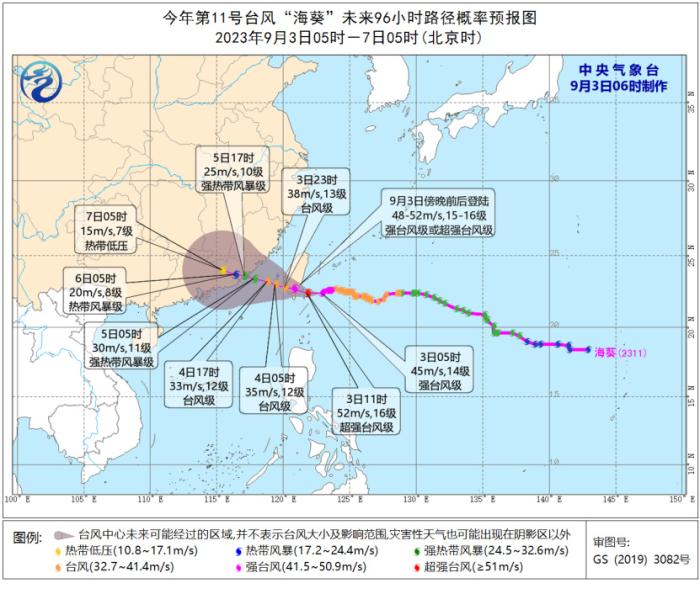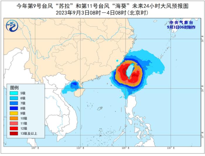 9月3日08時至4日08時,受“??庇绊?,巴士海峽、臺灣海峽、臺灣以東洋面、東海南部及釣魚島附近海域以及浙江南部沿海、福建沿海、臺灣島沿海將有6-8級、陣風(fēng)9-10級大風(fēng),部分海域或地區(qū)的風(fēng)力有9-12級,陣風(fēng)13-14級,“??敝行慕?jīng)過的附近海面或地區(qū)的風(fēng)力有13-16級,陣風(fēng)17級。
