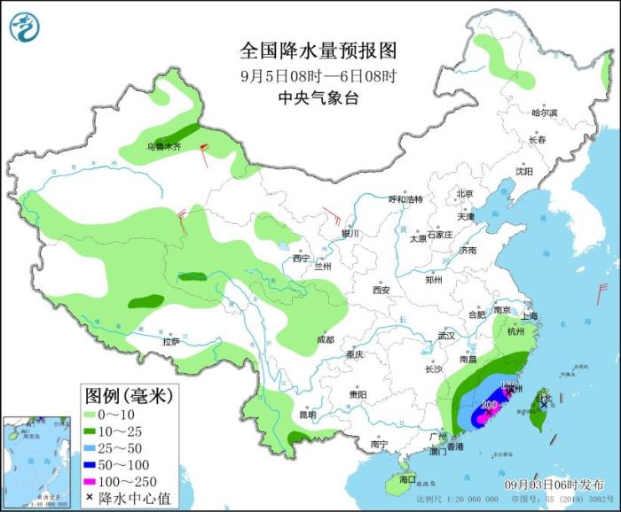 9月5日08時至6日08時,新疆沿天山地區(qū)、浙江南部、福建大部、江西東南部、廣東中東部、臺灣島等地部分地區(qū)有中到大雨,其中,福建東南部、廣東東部等地部分地區(qū)有暴雨或大暴雨(100~200毫米)。內(nèi)蒙古西北部、青海西部等地部分地區(qū)有4~6級風(fēng),其中,新疆東部部分地區(qū)有8~9級風(fēng)。東海南部、臺灣以東洋面、臺灣海峽、巴士海峽、南海東北部有6~8級大風(fēng)、陣風(fēng)10~11級,其中臺灣以東洋面、臺灣海峽、巴士海峽北部、南海東北部部分海域風(fēng)力可達9~11級、陣風(fēng)13~14級。
