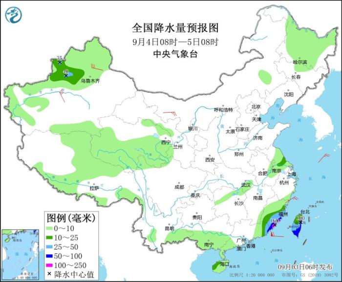 9月4日08時至5日08時,新疆沿天山地區(qū)和伊犁河谷、福建東南部、廣東東部、海南島西北部、臺灣島等地部分地區(qū)有中到大雨,其中,福建東南部沿海地區(qū)、廣東東南部沿海、臺灣島東部等地部分地區(qū)有暴雨或大暴雨(100~160毫米)。內(nèi)蒙古西北部、新疆南疆盆地、福建東部沿海等地部分地區(qū)有5~7級風(fēng)。東海南部、臺灣以東洋面、臺灣海峽、巴士海峽、南海東北部有6~8級大風(fēng)、陣風(fēng)10~11級,其中臺灣以東洋面、臺灣海峽、巴士海峽北部、南海東北部部分海域風(fēng)力可達9~11級、陣風(fēng)13~14級。