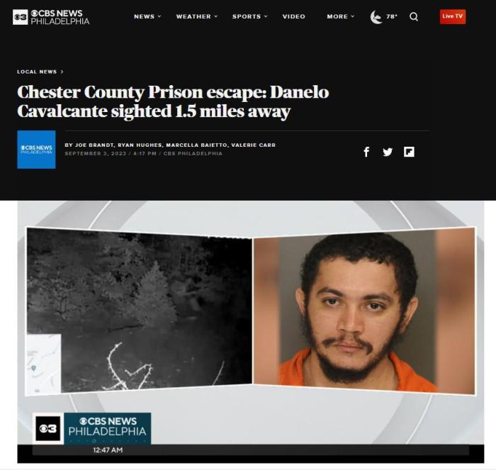 據(jù)報道,該犯人為34歲的達(dá)內(nèi)洛·卡瓦爾坎特。當(dāng)?shù)貢r間8月31日上午,他在等待被轉(zhuǎn)移至州監(jiān)獄時,從賓州費城郊區(qū)的監(jiān)獄越獄,官方尚未透露其越獄的細(xì)節(jié)。