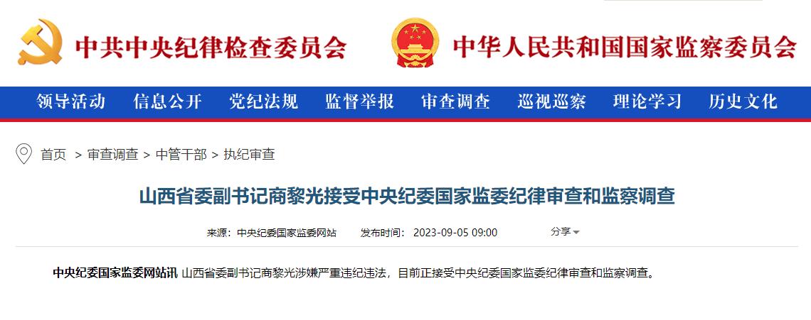 - 山西省委副書記商黎光接受中央紀(jì)委國家監(jiān)委紀(jì)律審查和監(jiān)察調(diào)查
