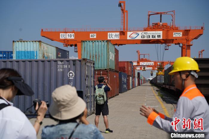 5日,“走進(jìn)壯美廣西·探尋向海之美”兩岸媒體人聯(lián)合采訪活動(dòng)來到位于廣西欽州的欽州鐵路集裝箱中心站和北部灣港欽州自動(dòng)化集裝箱碼頭。作為西部陸海新通道的重要節(jié)點(diǎn),欽州的樞紐通道優(yōu)勢越發(fā)凸顯。在鐵海聯(lián)運(yùn)新模式下,來自泰國、新加坡等“一帶一路”沿線國家和中國西部地區(qū)的貨物在這里實(shí)現(xiàn)“下船即上車,下車即上船”。