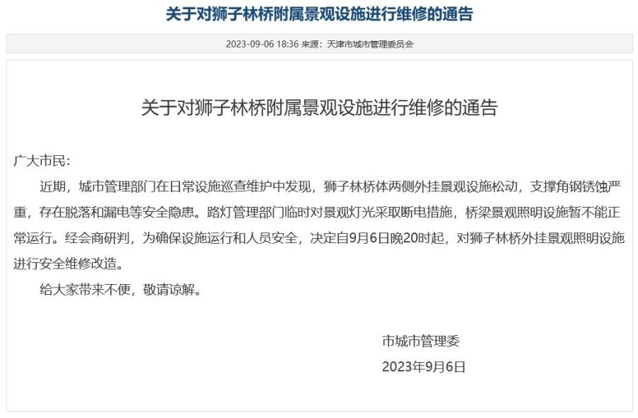 中新網(wǎng)9月7日電 6日,天津市城市管理委員會(huì)發(fā)出通告,對獅子林橋附屬景觀設(shè)施進(jìn)行維修。天津市城市管理委表示,近期,城市管理部門在日常設(shè)施巡查維護(hù)中發(fā)現(xiàn),獅子林橋體兩側(cè)外掛景觀設(shè)施松動(dòng),支撐角鋼銹蝕嚴(yán)重,存在脫落和漏電等安全隱患。路燈管理部門臨時(shí)對景觀燈光采取斷電措施,橋梁景觀照明設(shè)施暫不能正常運(yùn)行。經(jīng)會(huì)商研判,為確保設(shè)施運(yùn)行和人員安全,決定自9月6日晚20時(shí)起,對獅子林橋外掛景觀照明設(shè)施進(jìn)行安全維修改造。