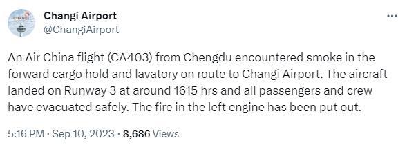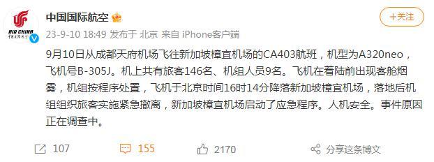 另據(jù)中國國際航空官方微博消息,10日從成都天府機場飛往新加坡樟宜機場的CA403航班在著陸前出現(xiàn)客艙煙霧,機組按程序處置,飛機于北京時間16時14分降落新加坡樟宜機場,落地后機組組織旅客實施緊急撤離,新加坡樟宜機場啟動了應(yīng)急程序。人機安全。事件原因正在調(diào)查中。