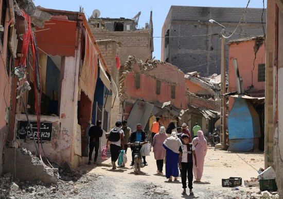 9月10日,在摩洛哥震中附近的艾米茲米茲村,人們從受損建筑旁經(jīng)過。新華社記者王東震攝
