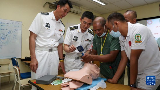 中國海軍“和平方舟”號醫(yī)院船派出醫(yī)療專家分隊赴東帝汶國立醫(yī)院進行ACLS培訓,醫(yī)院船醫(yī)療專家為當地醫(yī)護人員進行實操講解(9月5日攝)。新華社記者 黎云 攝
