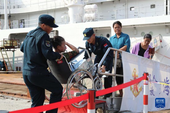 中國海軍“和平方舟”號醫(yī)院船訪問東帝汶并開展醫(yī)療服務期間,醫(yī)院船官兵為當地行動不便的患者服務(9月6日攝)。新華社發(fā)(桂江波 攝)