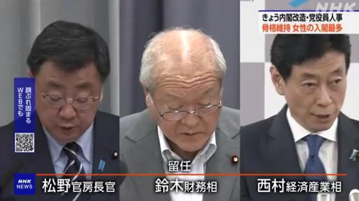 新一屆內閣中,日本內閣官房長官、財務大臣和經濟產業(yè)大臣等職位沒有進行調整。圖片來源:日本放送協(xié)會(NHK)報道截圖