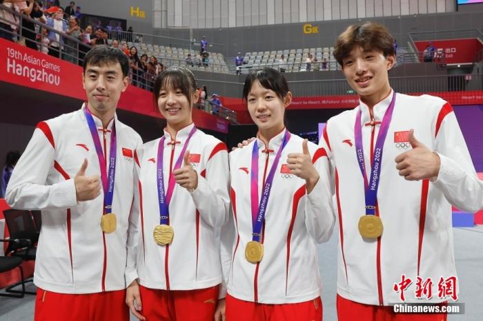 9月25日晚,杭州第19屆亞運會跆拳道競技混合團體賽決賽在臨安體育文化會展中心體育館舉行。中國隊以84比77戰(zhàn)勝韓國隊,獲得冠軍。圖為冠軍中國選手宋兆祥、周澤琪、宋潔、崔陽(從左至右)在頒獎儀式后合影。