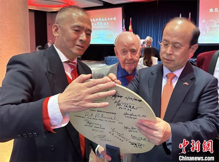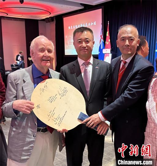 9月28日,中國駐澳大利亞使館與駐悉尼總領(lǐng)館在悉尼聯(lián)合舉辦國慶招待會,隆重慶祝中華人民共和國成立74周年。圖為中國駐澳大利亞大使肖千(右)在澳大利亞乒乓老將諾爾(中)的乒乓球板上簽字留念。中新社記者 顧時宏 攝