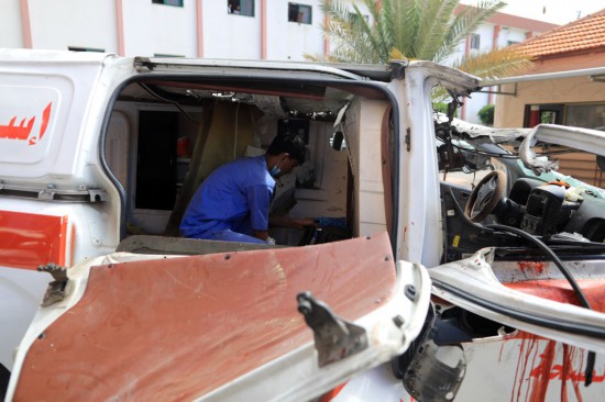 ↑這是10月7日在加沙地帶城市汗尤尼斯拍攝的在以色列空襲中受損的救護車。新華社發(fā)(哈立德·奧馬爾攝)