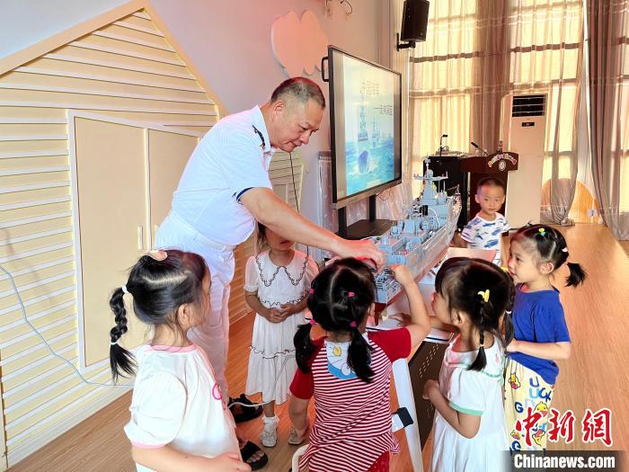 圖為潘雄為幼兒園小朋友介紹艦艇知識(shí)。漳州市退役軍人事務(wù)局 供圖