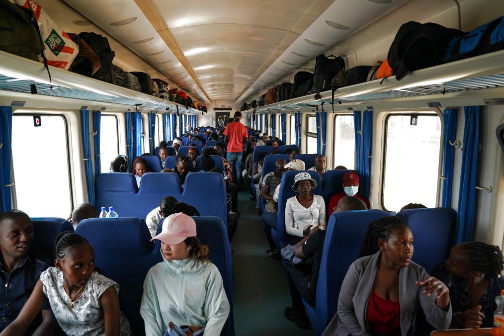 9月20日,在肯尼亞蒙內(nèi)鐵路內(nèi)羅畢站,乘客坐在即將開往蒙巴薩的客運列車車廂內(nèi)。新華社記者韓旭攝
